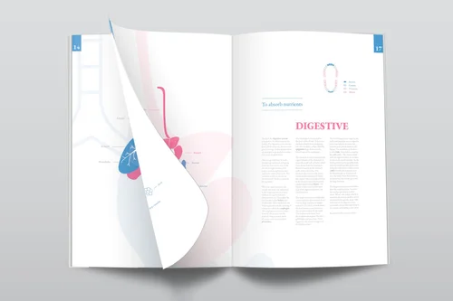 This editorial highlights the main organ systems which exist in the human body. Custom made, simple illustrations are paired with digestable text and bolded terms later explained in the glossary. My goal was to present anatomy and physiology in an easy to read manner, especially to medical/science students.